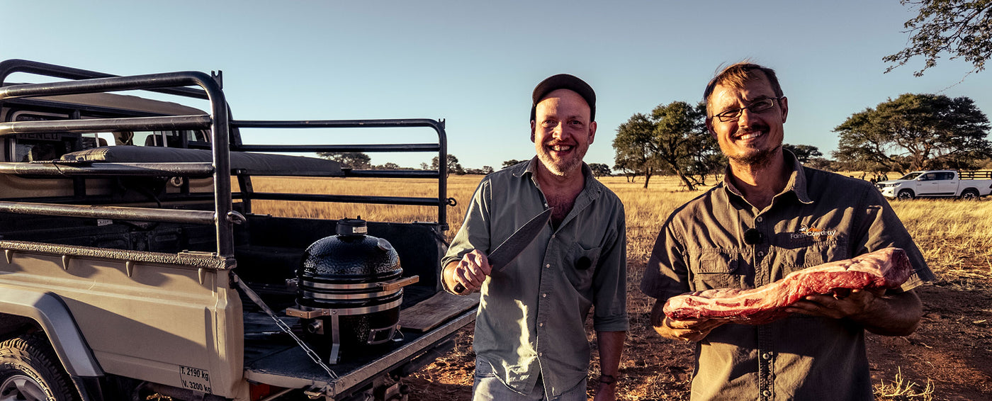Eine namibische Rinderfarm, betrieben von Farmern mit deutschem Hintergrund, irgendwo im Nirgendwo. Freilandhaltung, die den Namen verdient. Kein Marketing, nur Weite, Zeit und Fleisch mit Geschmack. Grillen in Lodges, bei denen selbst der Horizont kurz innehält. Feuer an, Fleisch drauf, Stille drumherum.