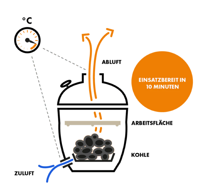 Der Kamado wird mit Holzkohle betrieben und durch den Kamineffekt erhitzt: Luft strömt durch die Zuluftöffnung in den Brennraum und versorgt die Glut mit Sauerstoff.