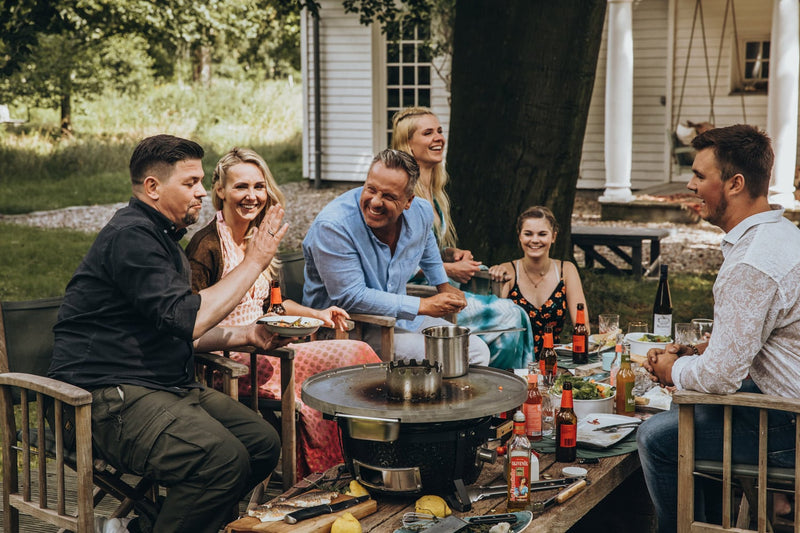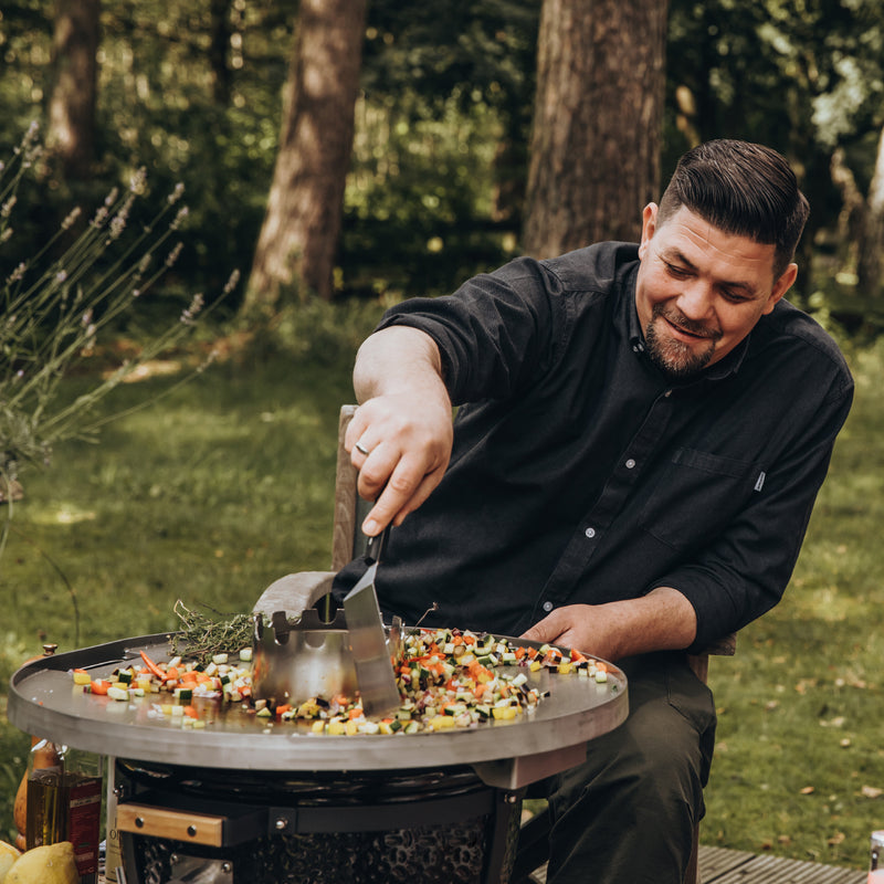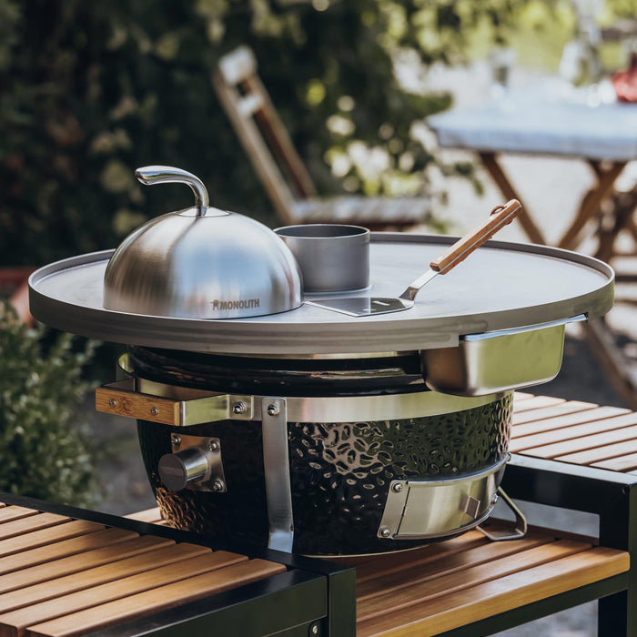 Das Besondere: Der Deckel lässt sich abnehmen und man kann den MONOLITH ICON dann als Tischgrill nutzen oder eine Feuerplatte aus Stahl aufsetzen. An die ICON Feuerplatte kann eine Auffangschale für Fett und Angebranntes angebracht werden. Er lässt sich so wie eine Art Plancha- oder Teppanyaki-Grill nutzen, mit verschiedenen Temperaturzonen. Dort wo die Feuerplatte direkt über der Glut ist, ist die Hitze sehr stark und nach außen zu den Überständen etwas niedriger. Das bedeutet, man kann in der Mitte scharf anbraten und nach außen zum Garen und Warmhalten rausziehen. Neben der Feuerplatte wartet der ICON mit jeder Menge Zubehör und unendlichen Grill-Möglichkeiten auf.