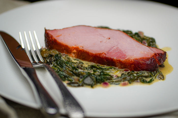 Selbstgepökelter Kassler mit Rahmspinat und karamellisierten Zwiebeln