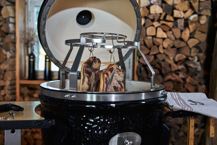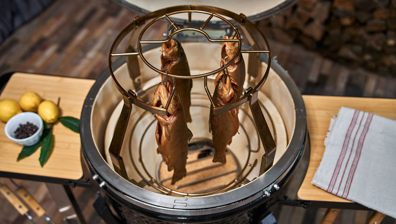 Seit vielen Jahren haben wir uns mit dem Thema Räuchern beschäftigt. Das ist eine sehr alte Methode der Konservierung und geschmacklichen Verfeinerung, die gerade von der Gastronomie und von Grill-Enthusiasten wiederentdeckt wird. Daher haben wir ein Set zum Räuchern für unsere Keramikgrills entwickelt, das sowohl das Heißräuchern als auch das Kalträuchern ermöglicht.