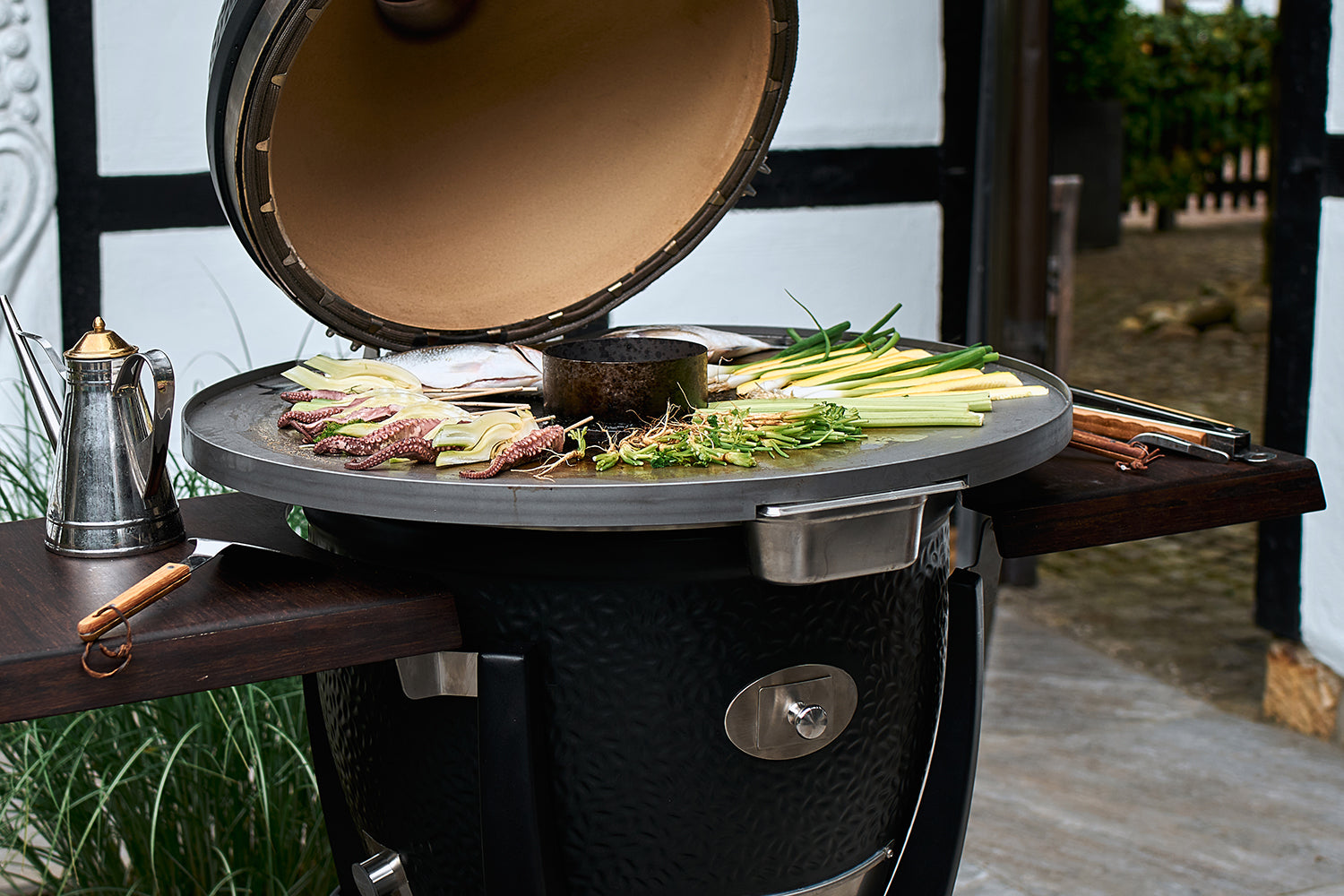 Erweitere jetzt deinen Traditionellen Kamado um die kulinarische Palette des Plancha-Grillens: Die Feuerplatte aus solidem, 8 mm dickem Stahl, die für eine außerordentliche Hitzespeicherung entwickelt wurde. Erlebe unterschiedliche Zubereitungsmöglichkeiten mit verschiedenen Temperaturzonen, für alle Gerichte, die auf einem Grillrost nicht möglich sind. Die Feuerplatte ist speziell für den .55 (CLASSIC) gestaltet und hat eine Abdichtung zum Keramikrand an der Unterseite. Da sich auf der Rückseite der Platte eine Aussparung befindet, musst du den Deckel des .55 (CLASSIC) nicht abnehmen. Die Feuerplatte steht etwa 13 cm über den Rand des .55 (CLASSIC) hinaus. Das sorgt für ein Temperaturgradienten von der Mitte bis zum Rand. Auf diese Weise kannst du auf der großen Fläche verschiedene Gerichte gleichzeitig zubereiten. In der mittigen „Hot-Zone“ kannst du dein Essen scharf anbraten, während du es am Rand langsam auf die richtige Kerntemperatur bringen oder warmhalten kannst. Die Feuerplatte hat zudem eine Aussparung für einen GN 1/16 Gastrobehälter, der als Fettauffangbehälter dient. Das erleichtert die Reinigung erheblich. Hinweis vom Hersteller: Es wird empfohlen, die Platte vor dem ersten Einsatz einzuheizen.